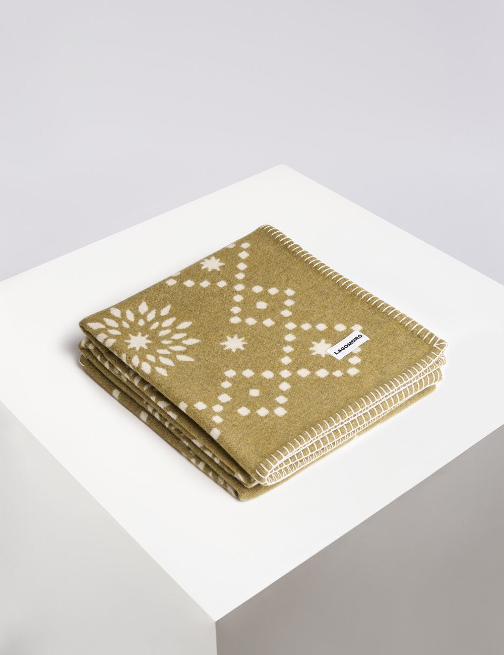 This blanket features a woven jacquard and and blanket stitch